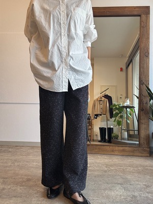 カタチはやや股上を浅め、特に後ろ又ぐりを従来よりも浅めに設定して小尻効果を狙ったワイドストレートシルエットのイージートラウザーズです。