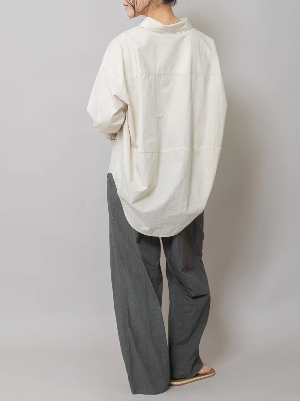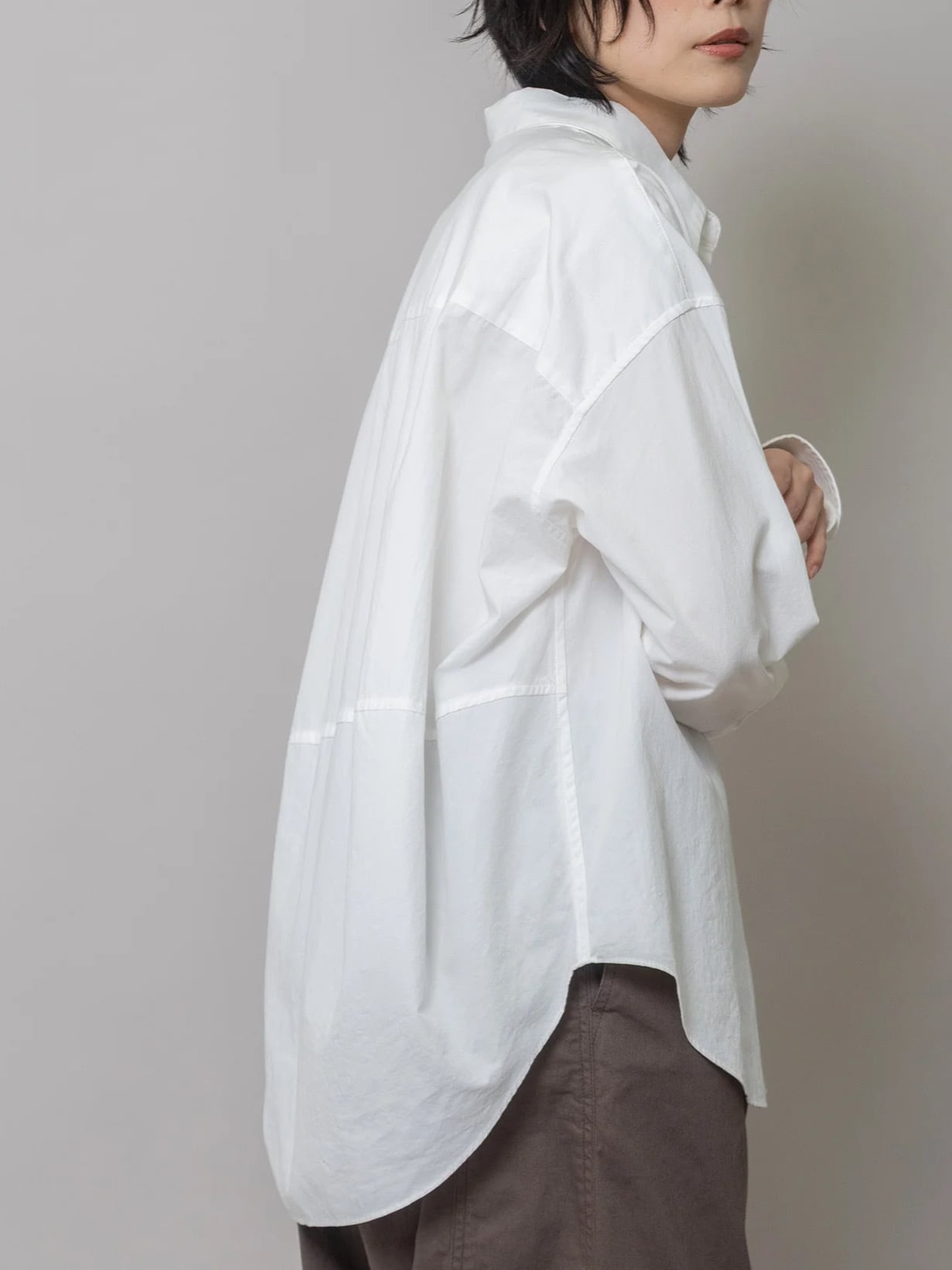 後ろの身幅をたっぷり取って展開したパターンにより立体的で丸みのある女性らしいバックスタイルに仕立てたシンプルなレギュラーカラーシャツです。