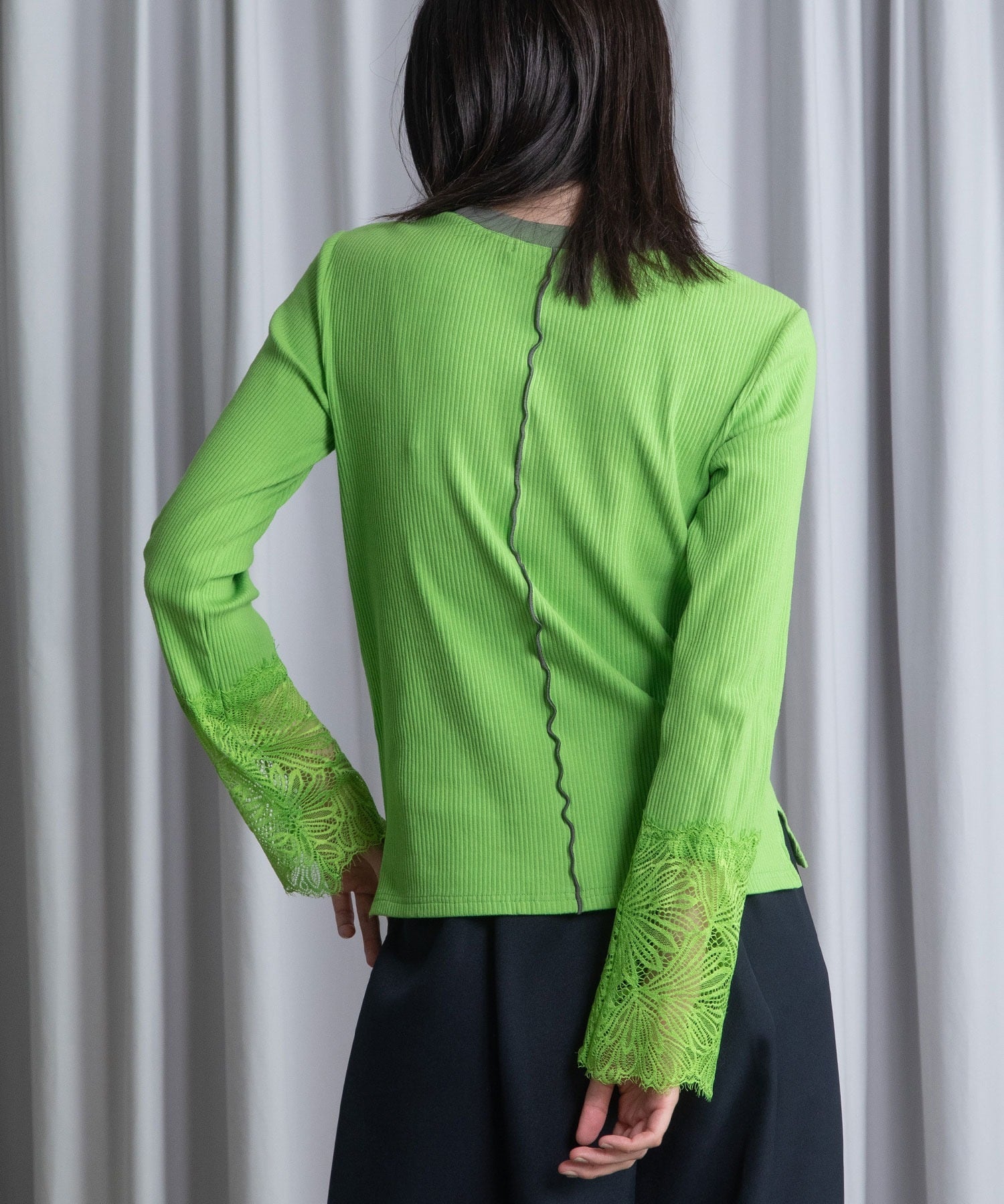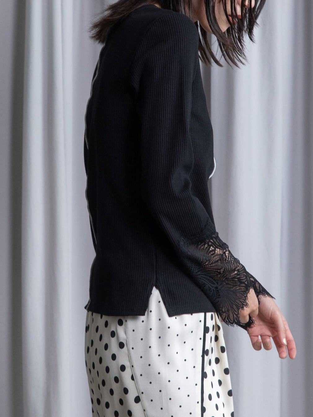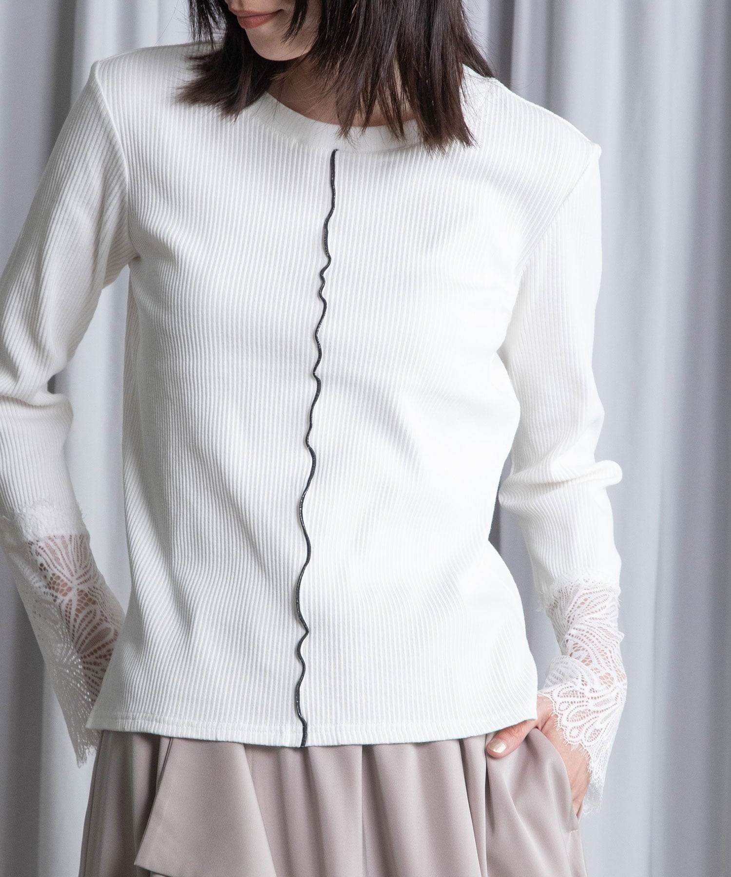センターに施されたつまみメローと、袖口の繊細なレースが印象的なリブ素材トップス。