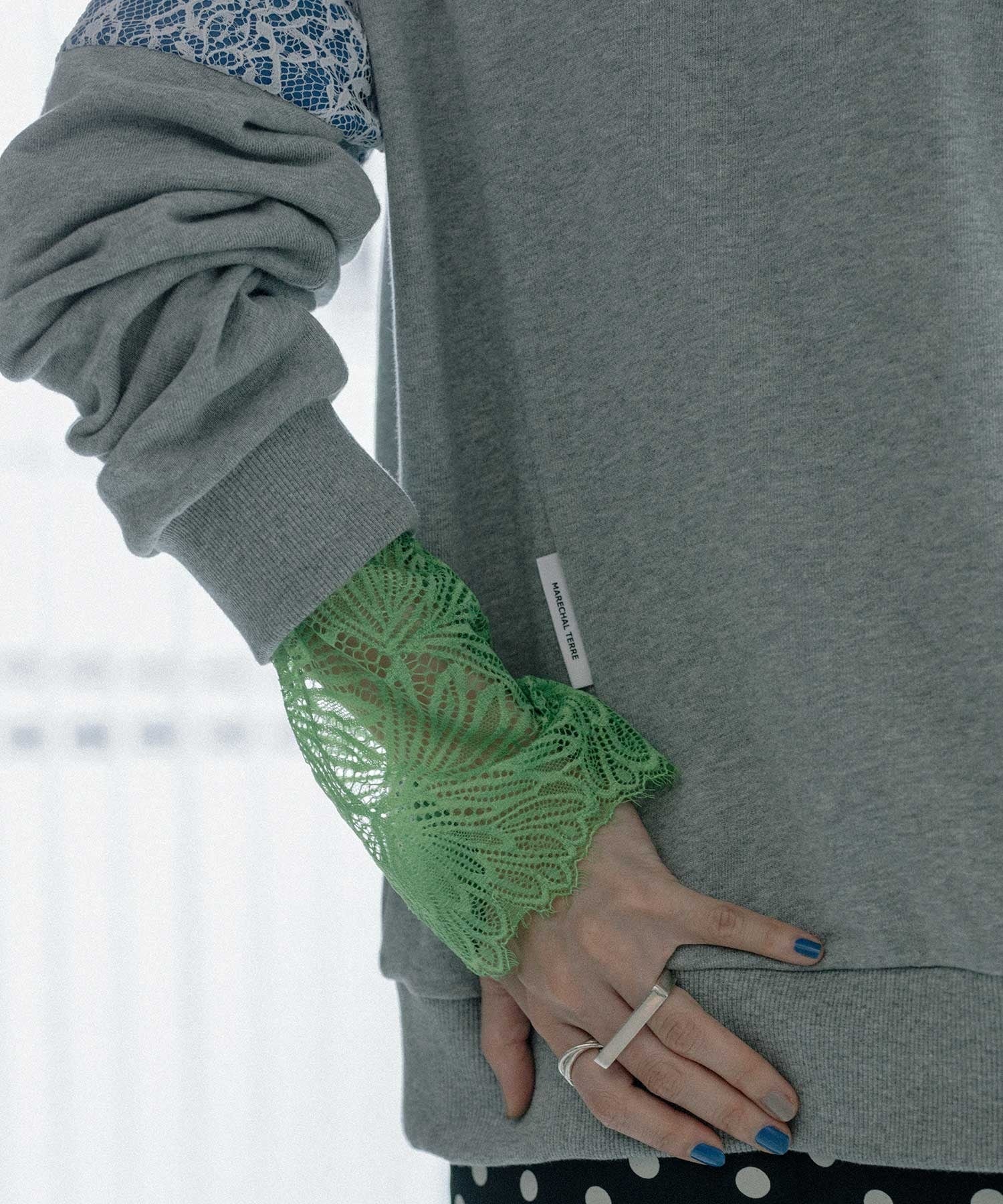 手元に視線を集める繊細なレース使いが、フェミニンさと抜け感を両立。