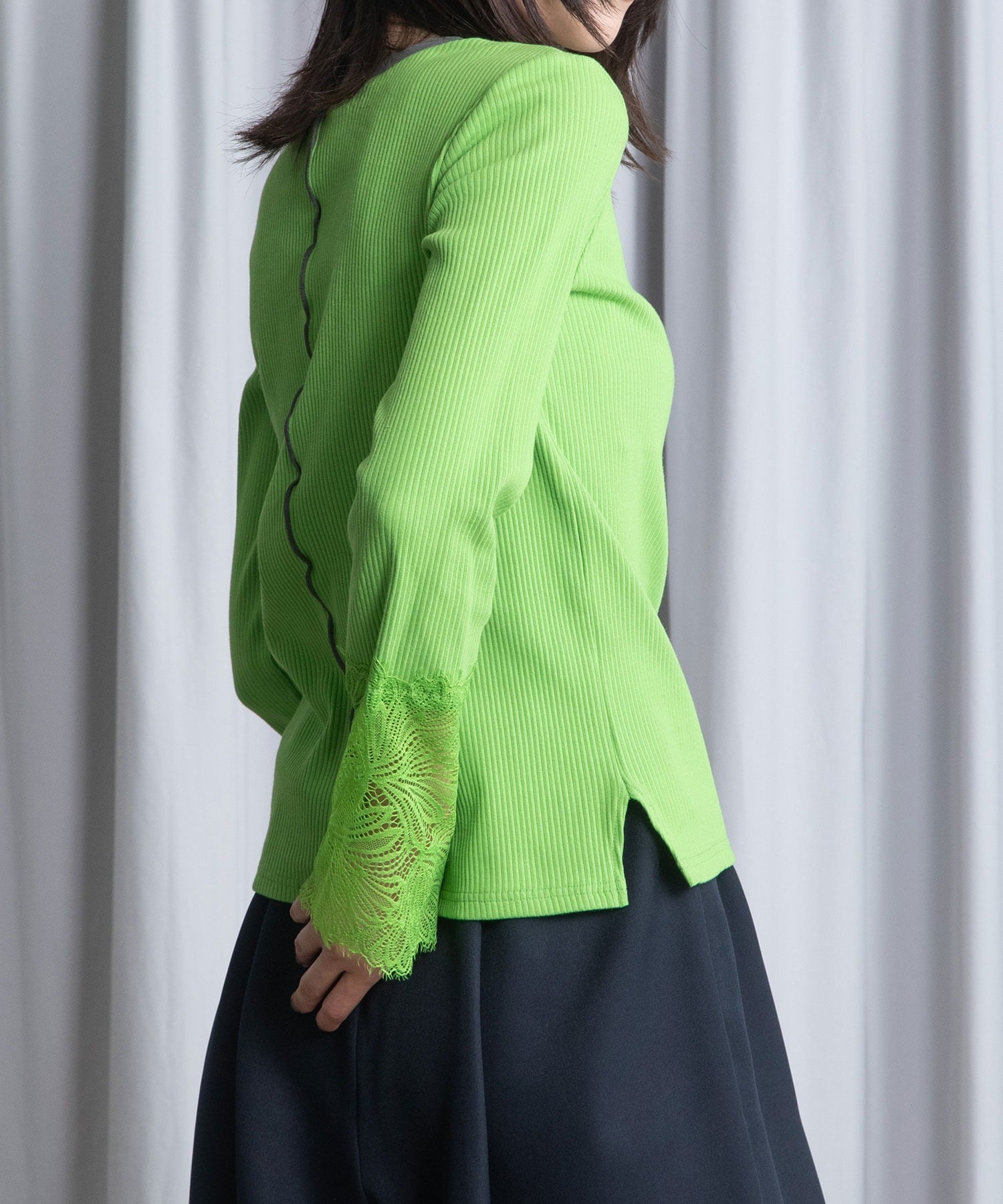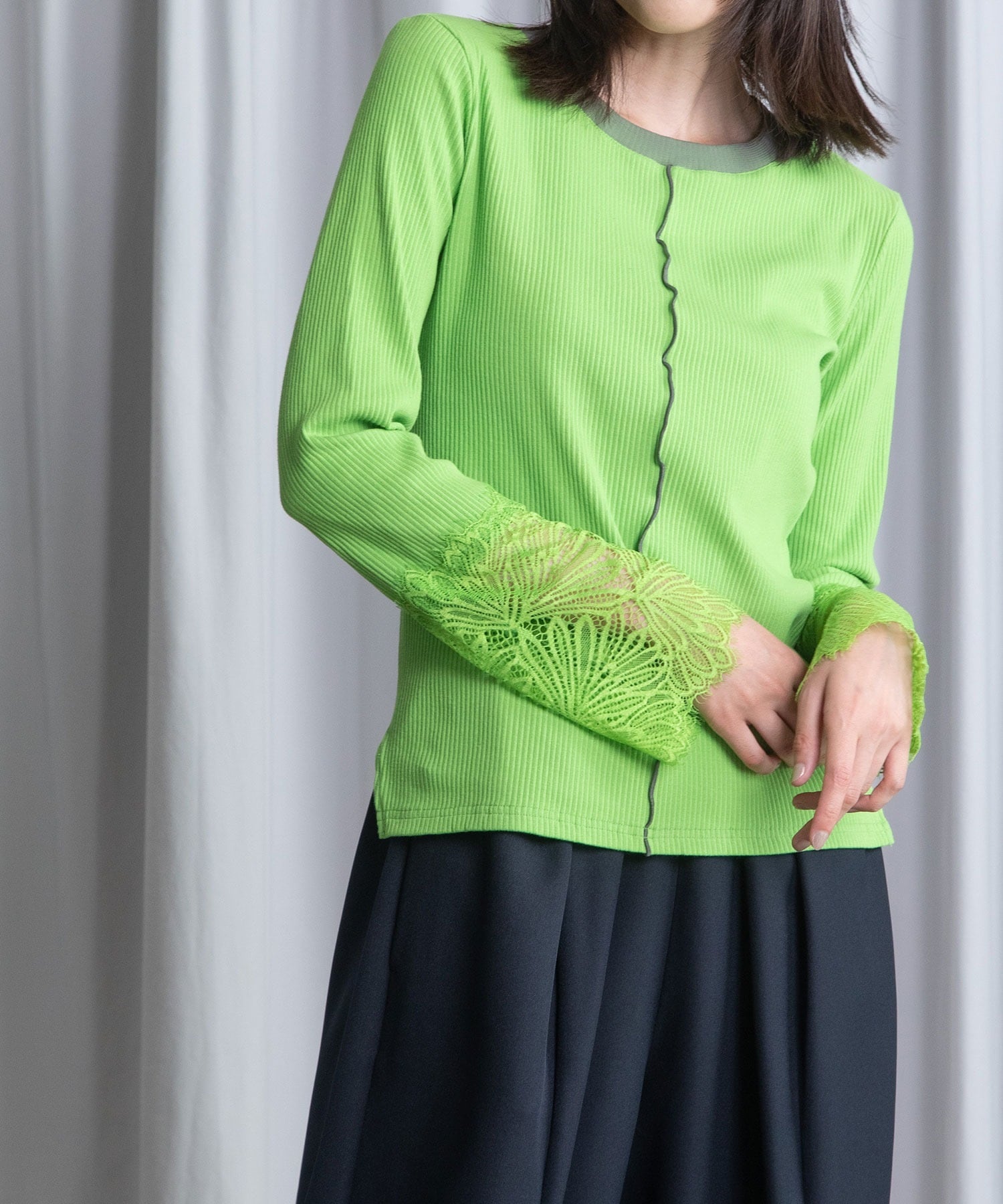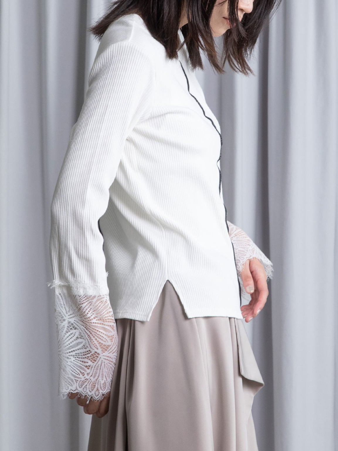 繊細なレース袖がさりげないフェミニンさを添えるリブトップス。