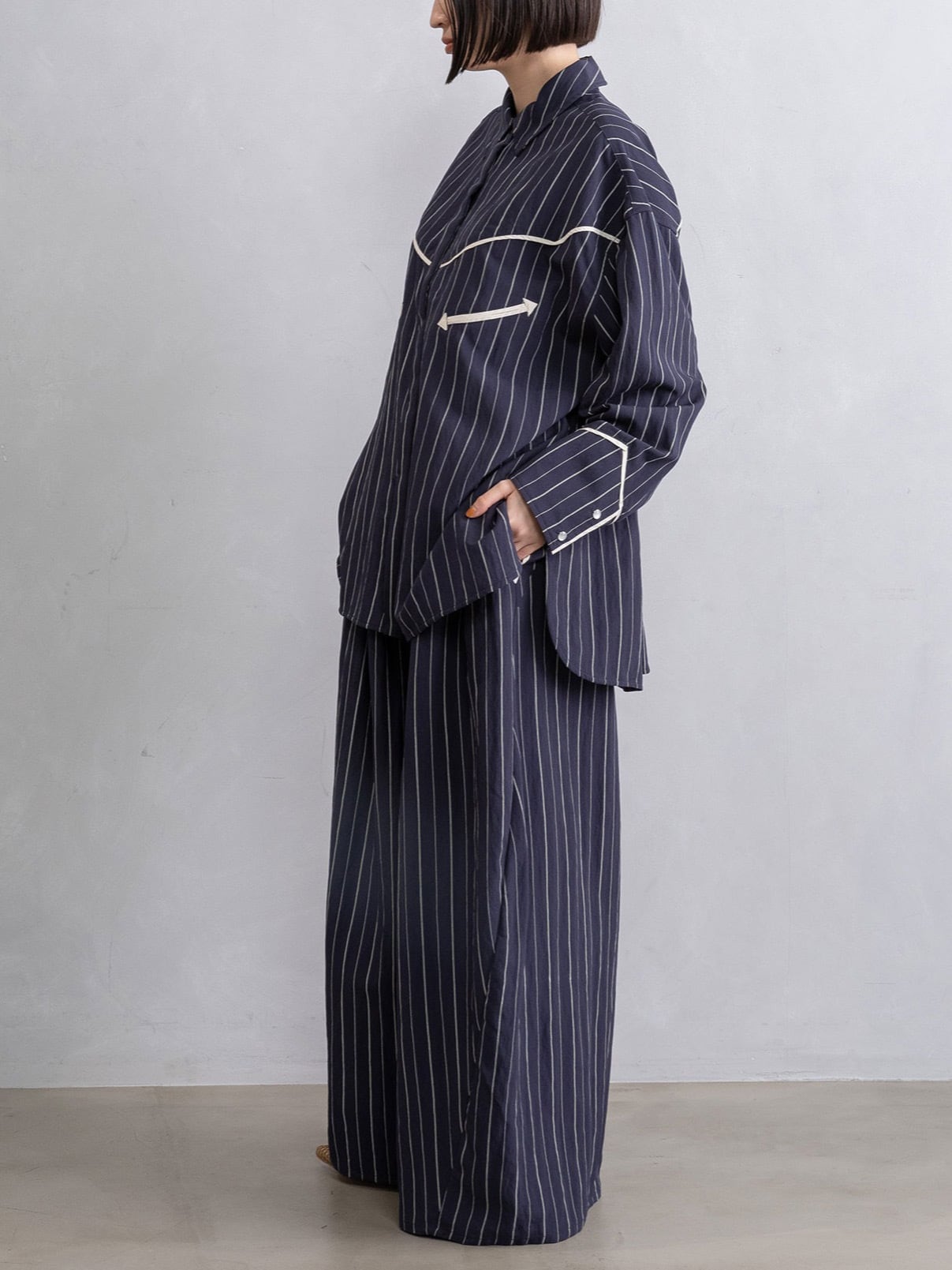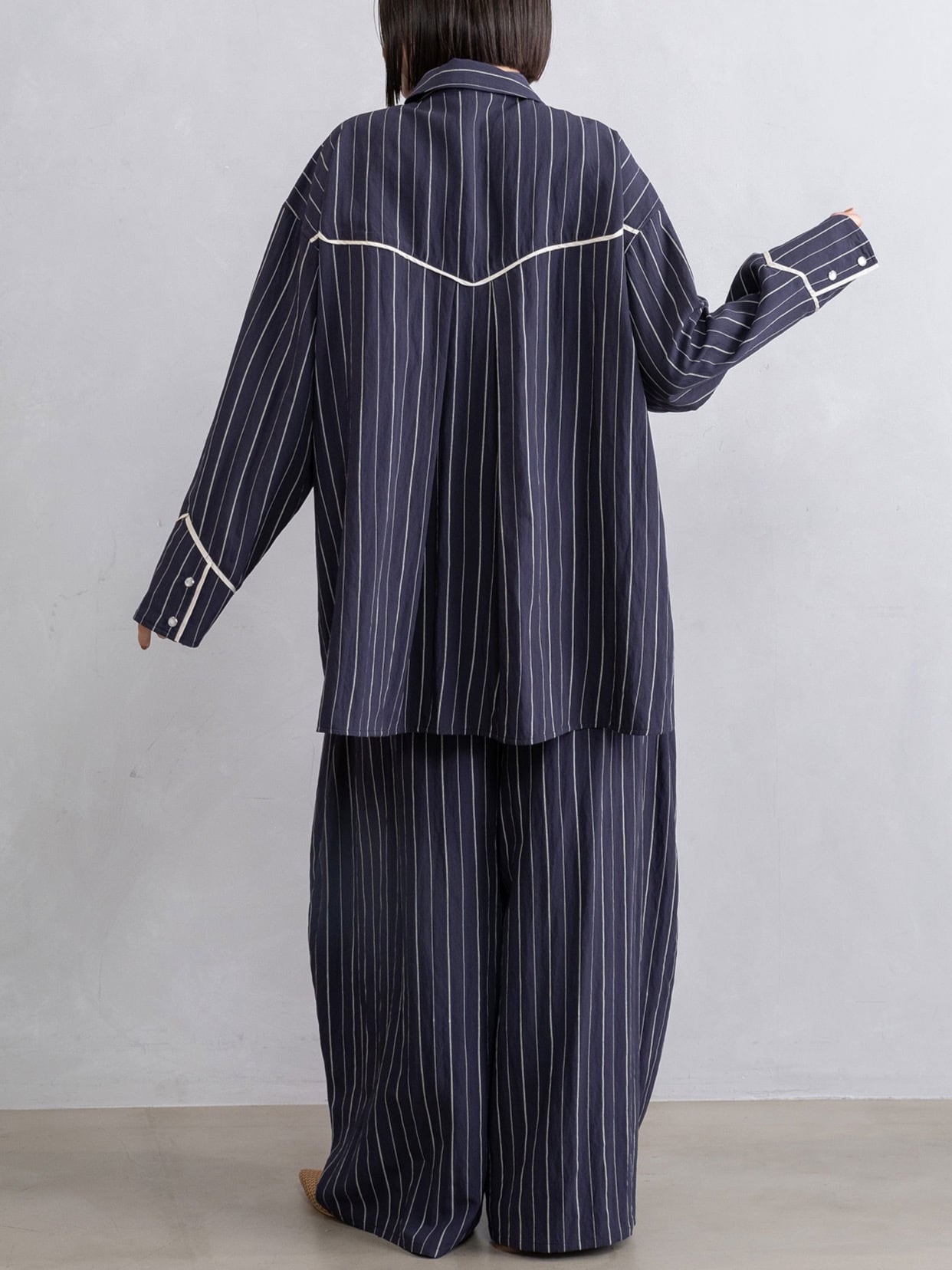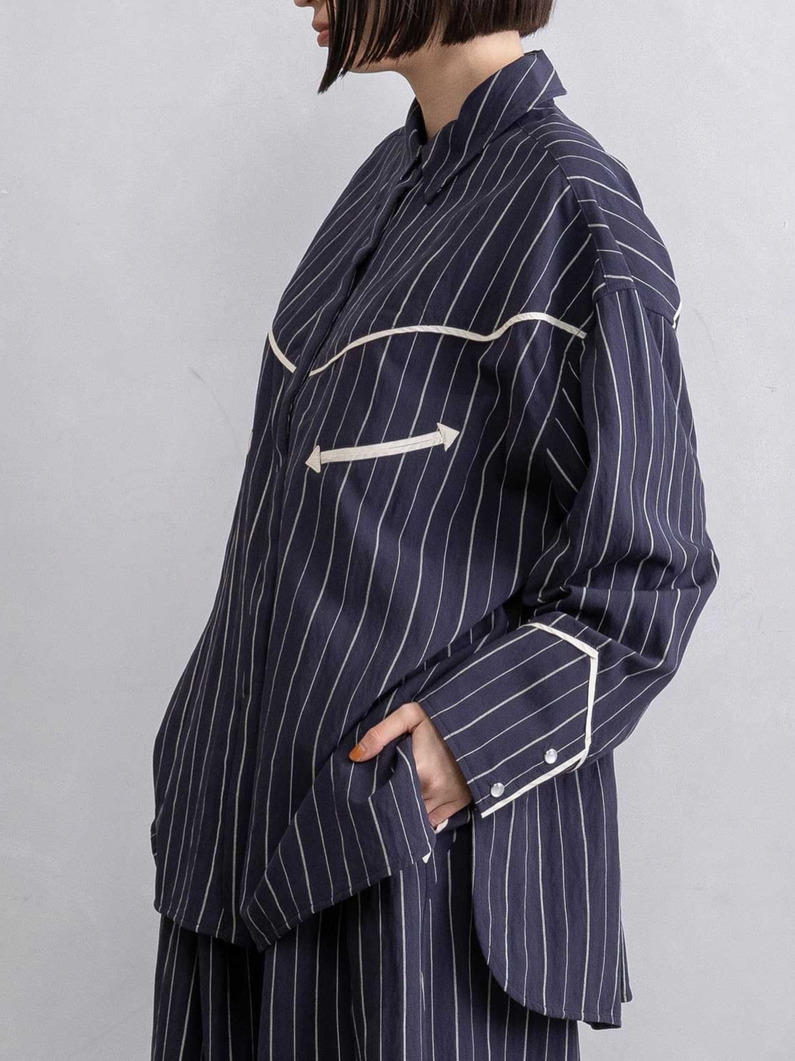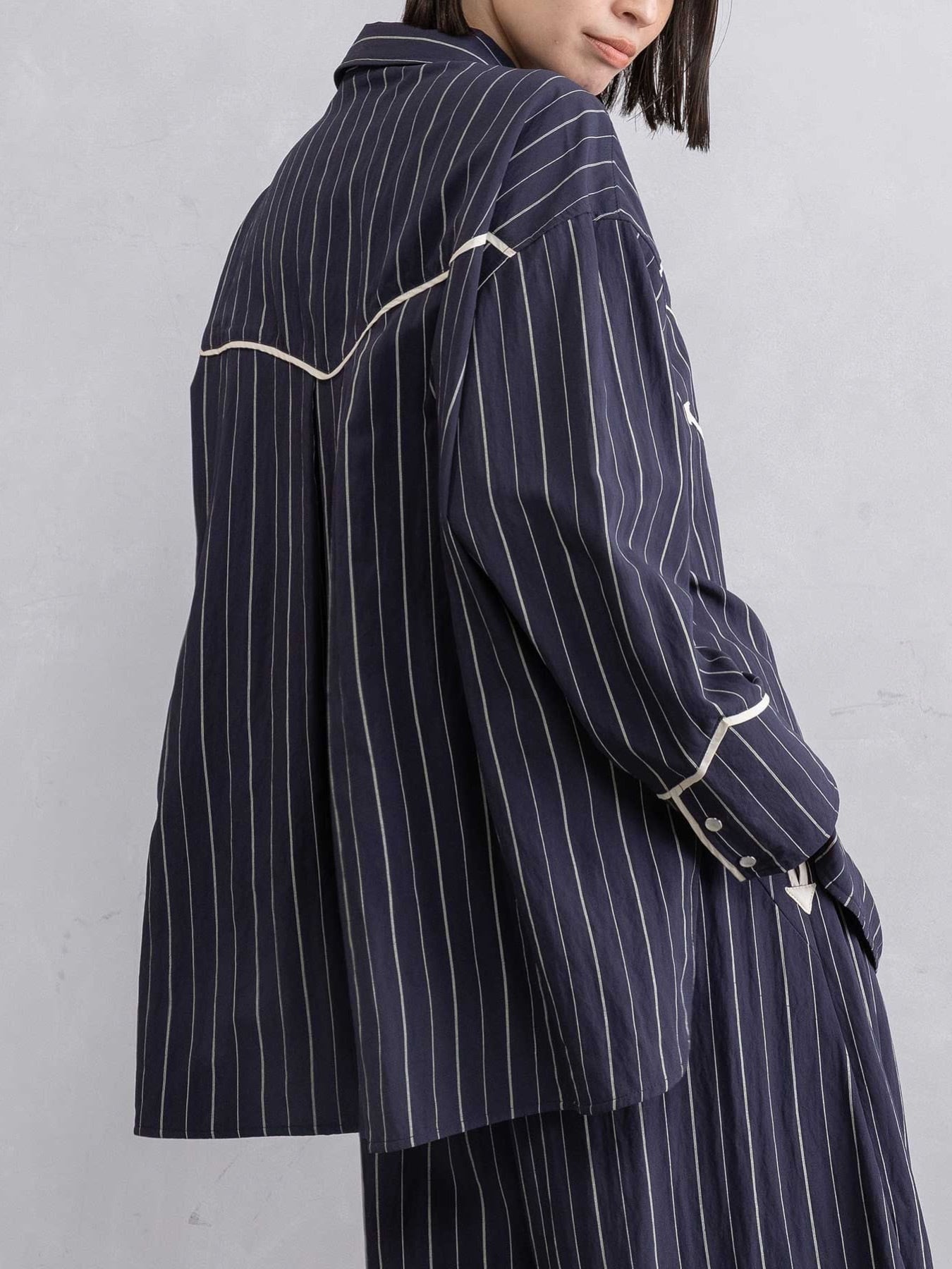 ゆったりとしたシルエットに、配色パイピングとストライプ柄が映えるデザインシャツ。