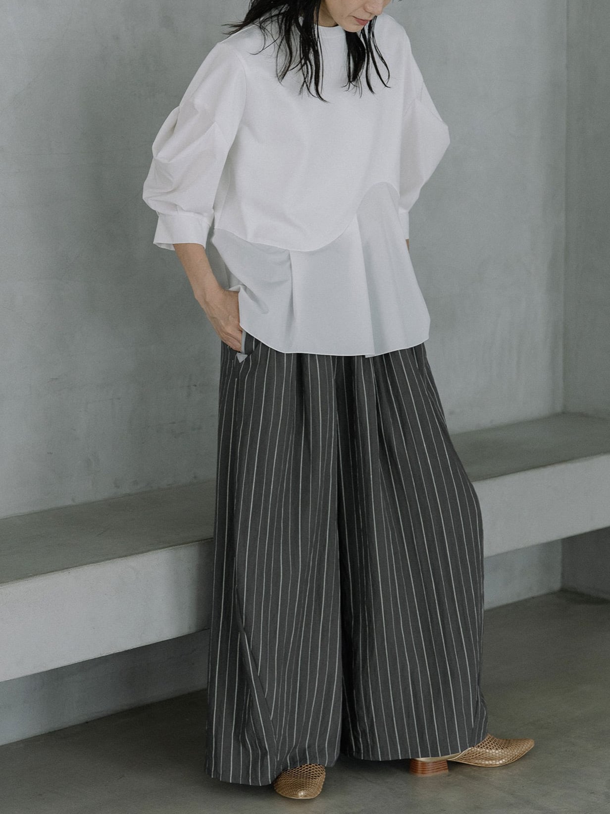 落ち感のある素材と、ゆったりとしたワイドシルエットが美しく揺れるワイドパンツ。