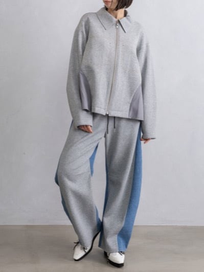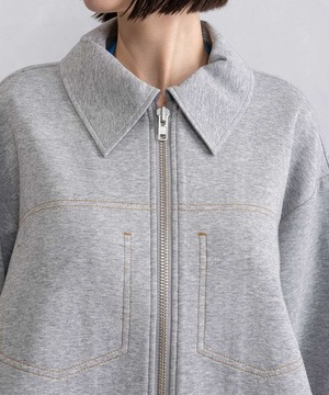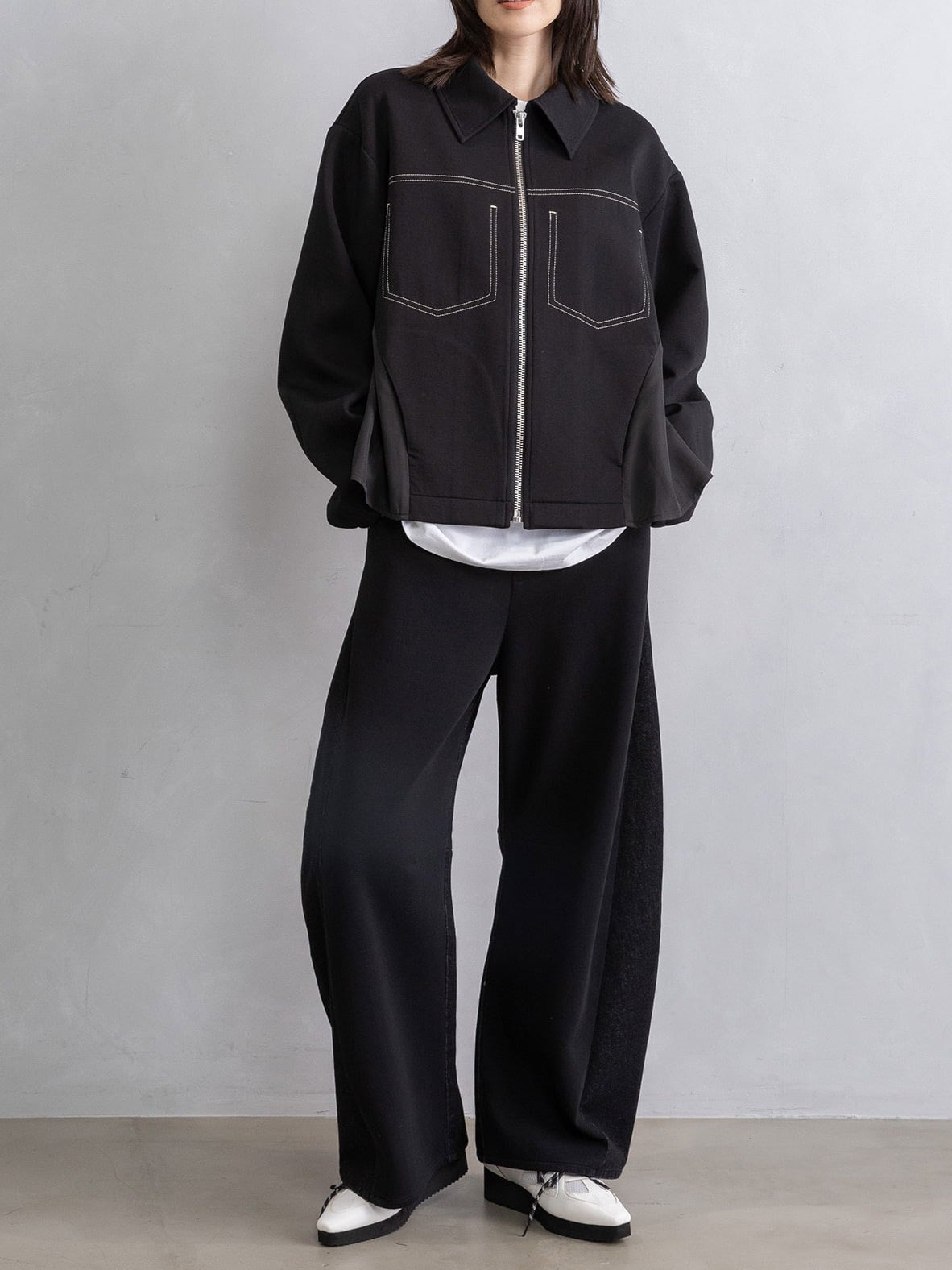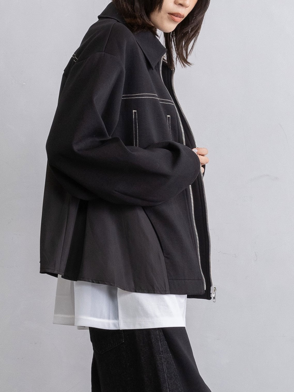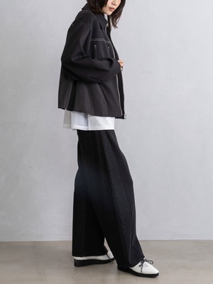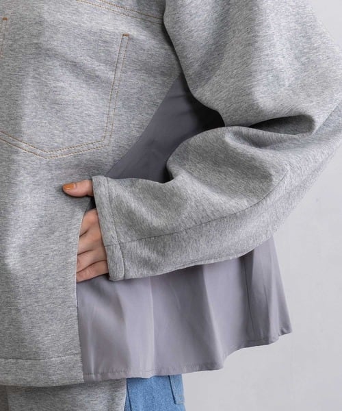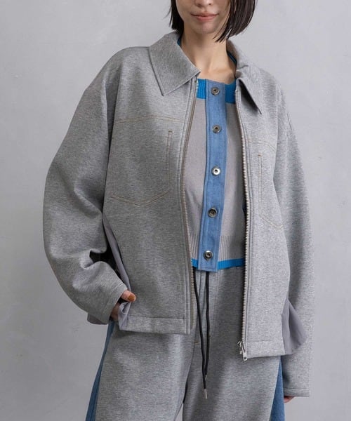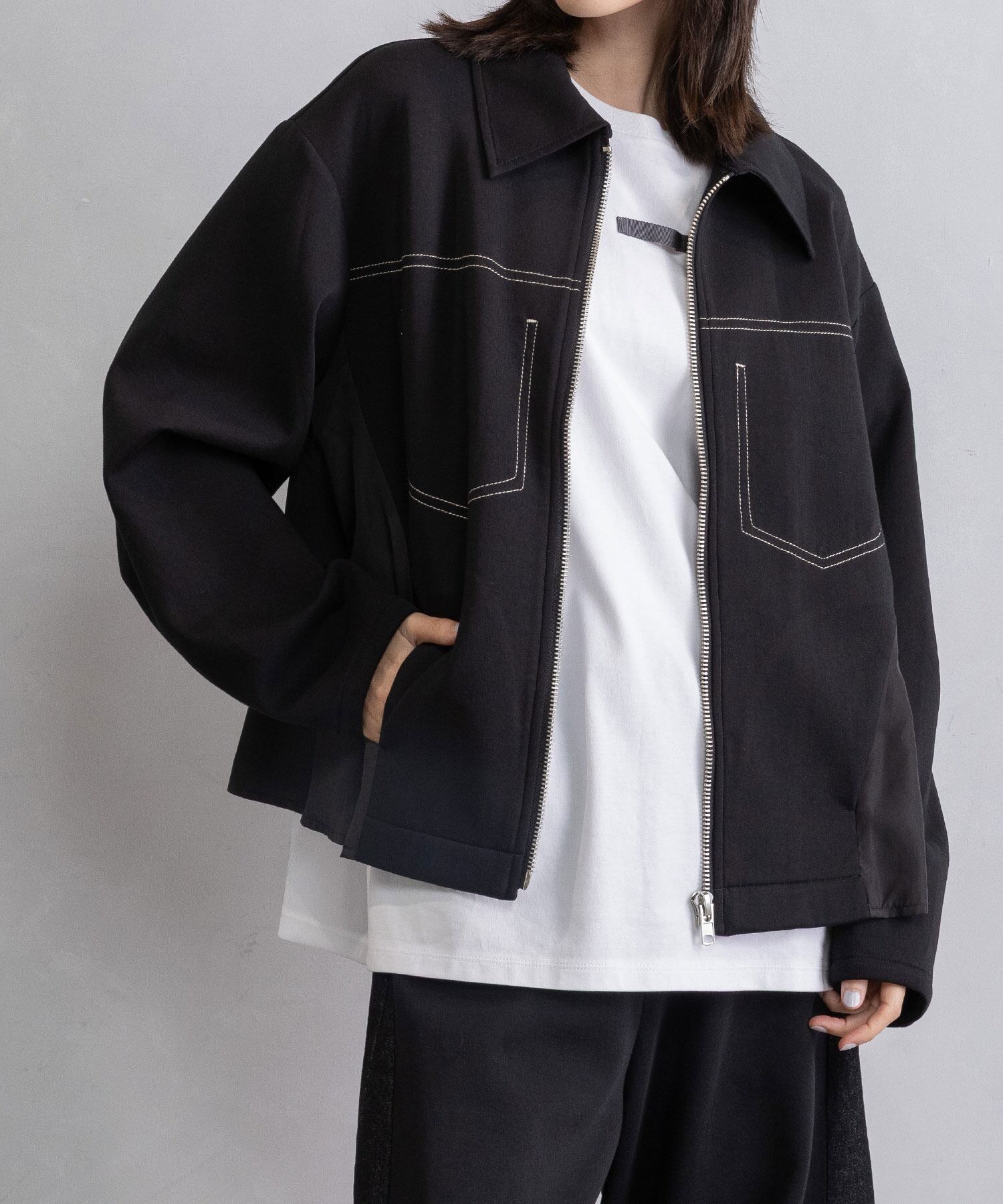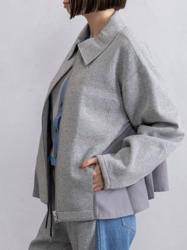 飾りステッチポケットや異素材の切替えでシンプルなブルゾンにモードなニュアンスをプラス。