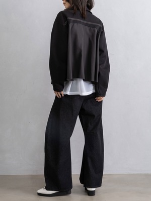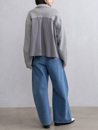 後身頃はヨークに配色ステッチを施し、異素材のタフタ中心にタックを入れ、裾に広がるAラインシルエット。
