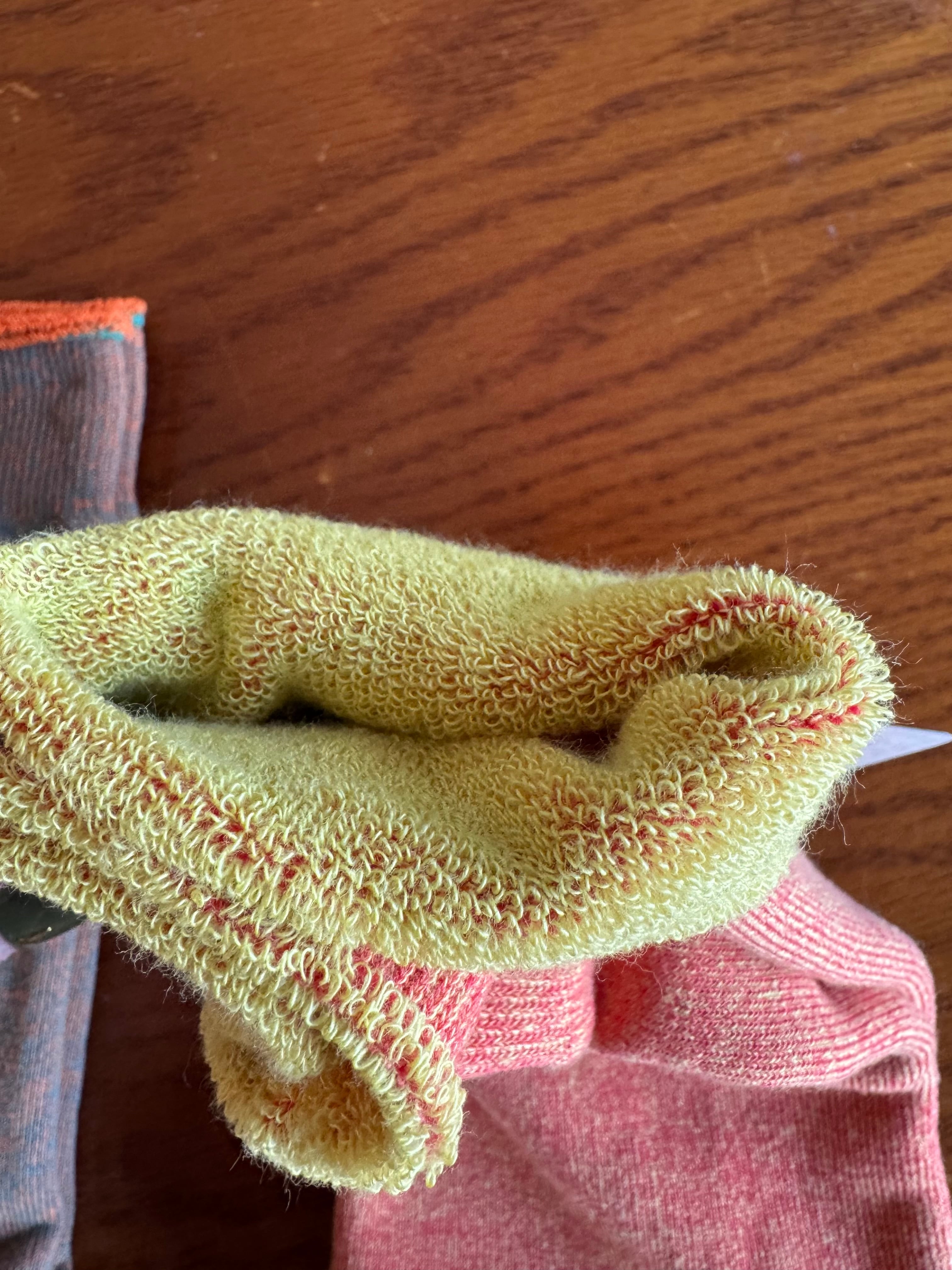 • 構造: 内側と外側で異なる色(バイカラー)の糸で編まれています。