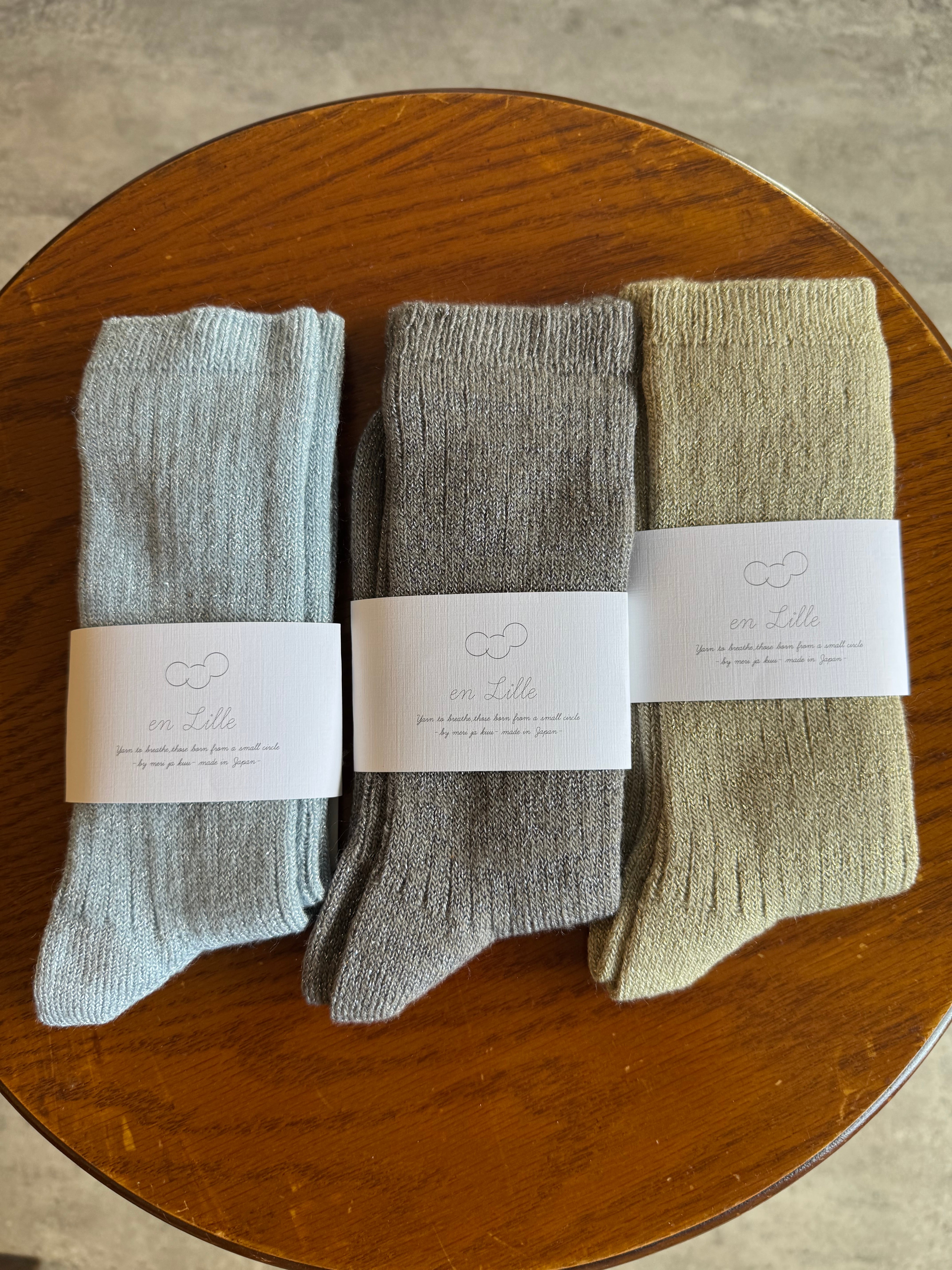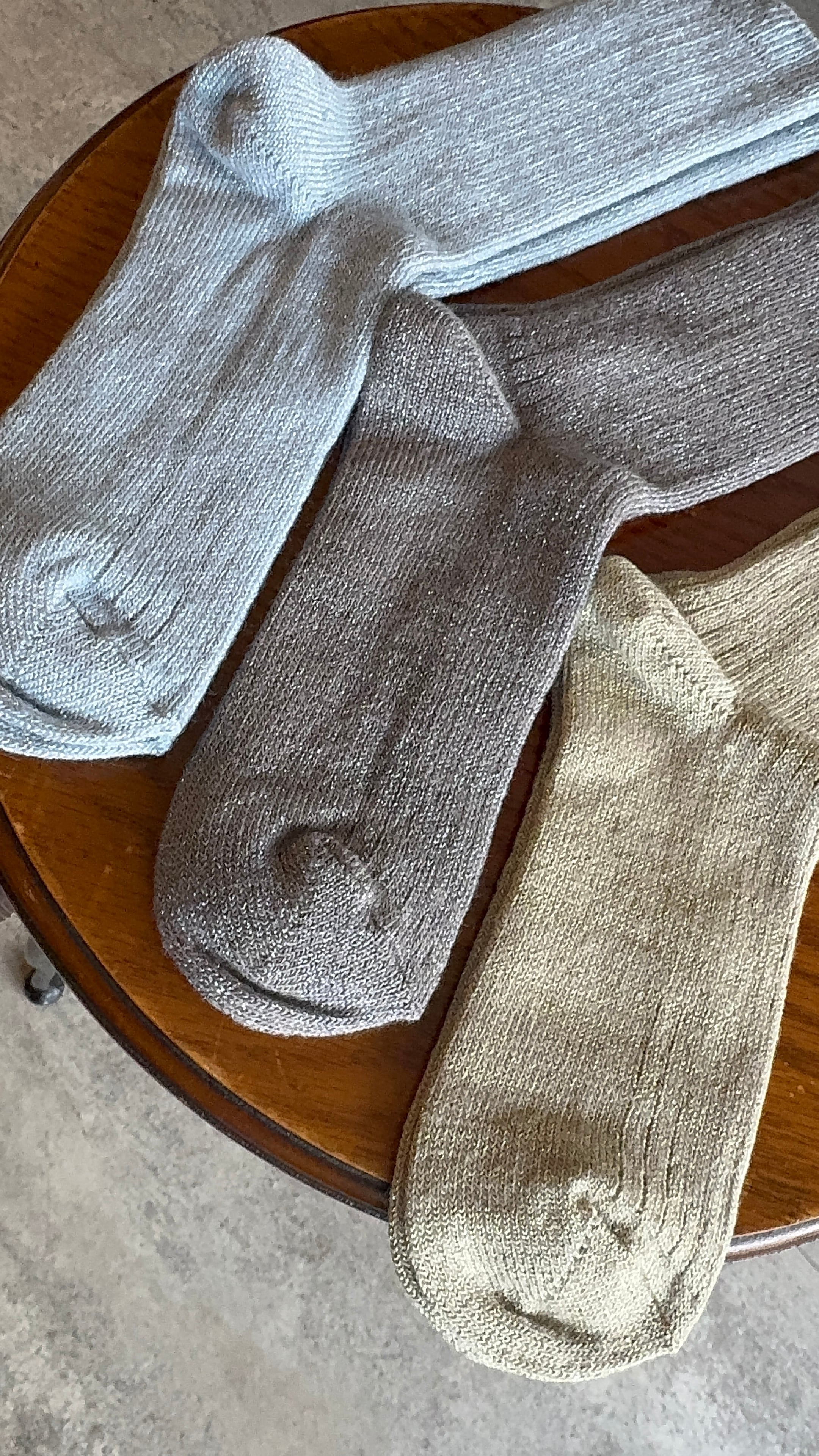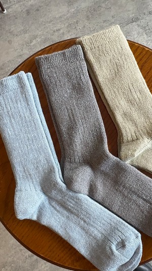 • 素材感: キラリと光る大き目のラメ糸と、アクリルウールを組み合わせてリブ編みにしています。
