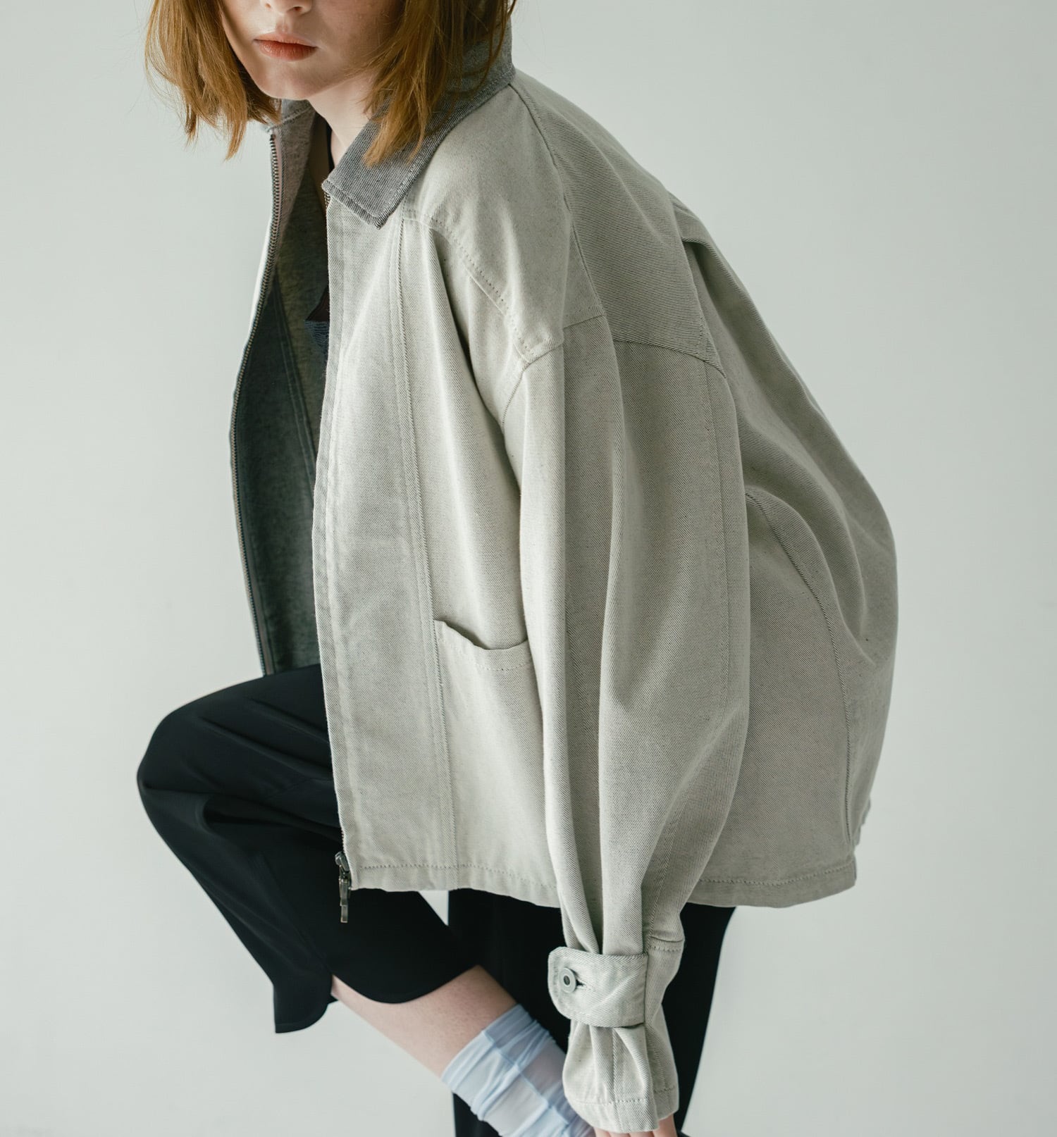 衿つきのルーズなデニムブルゾンです。